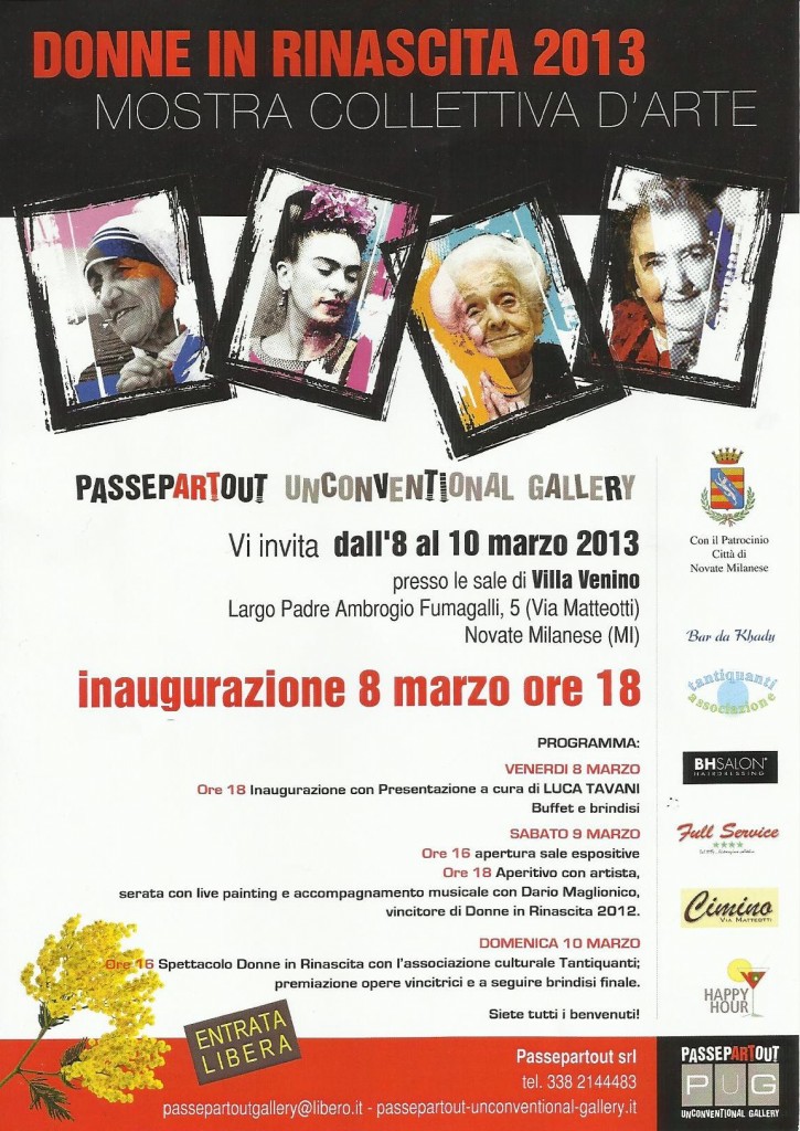 8/9/10 MARZO 2013 c/o Villa Venino, Novate Milanese (MI) Madre Teresa di Calcutta, Frida Kahlo, Rita Levi Montalcini, Alda Merini. Tormento, violenza, abuso, solitudine, tradimento, follia, rinascita, affermazione, emancipazione e amore. Un omaggio a quattro donne, nel giorno a loro dedicato.