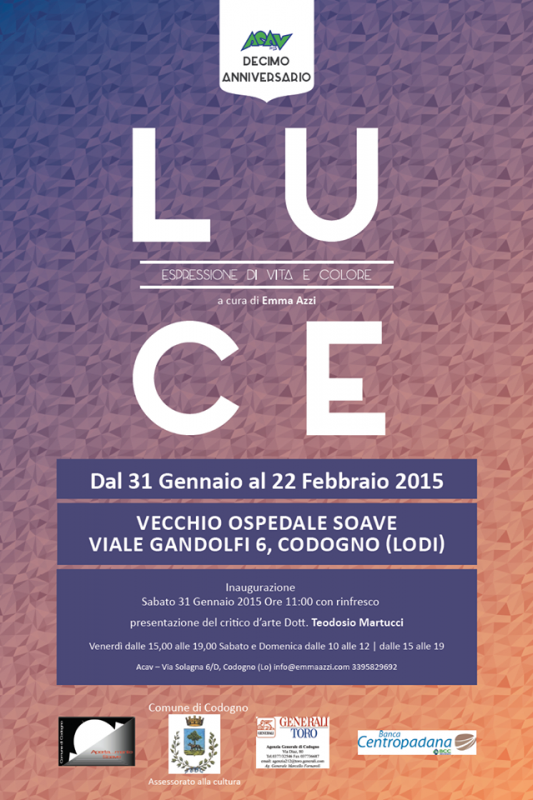 Dal 31 Gennaio al 22 Febbraio 2015 Collettiva d’Arte “LUCE” Espressione di vita e colore, Palazzo Soave, Viale Gandolfi 6, Codogno (Lo)