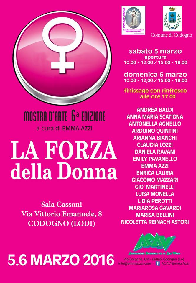 Sabato 5 e Domenica 6 Marzo Mostra d’Arte “La Forza della Donna” Sala Cassoni, Via Vittorio Emanuele 8, Codogno (LO)