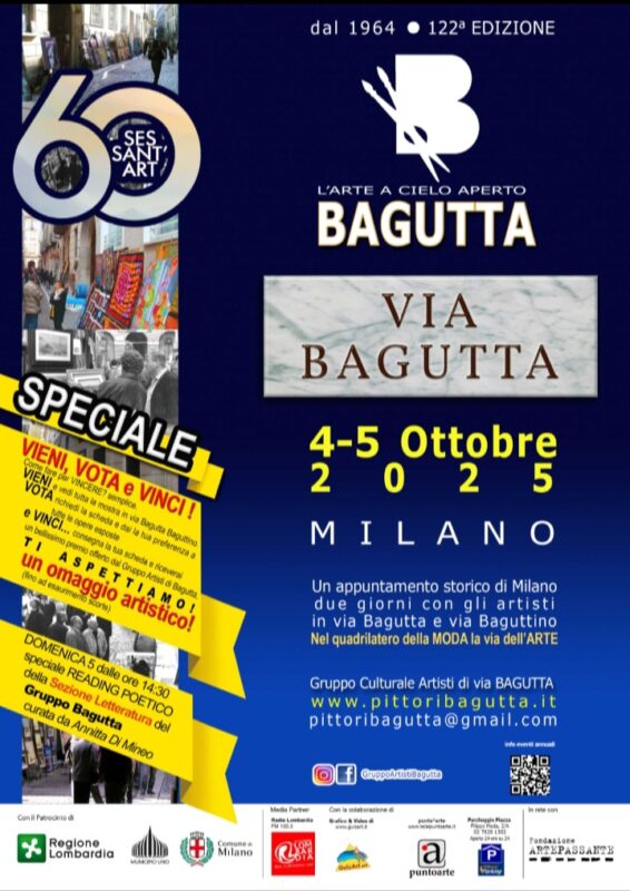 Sabato 25 Ottobre 2025 si svolgerà la Mostra d’Arte Bagutta in C.so Garibaldi, Milano. Dalle 9.30 alle 18.30 pittori, scultori e fotografi esporranno le loro opere piu’ rappresentative. Una giornata all’insegna dell’arte e della cultura in una Via ricca di locali e ristoranti tipici, a due passi da Brera. Vi aspettiamo!